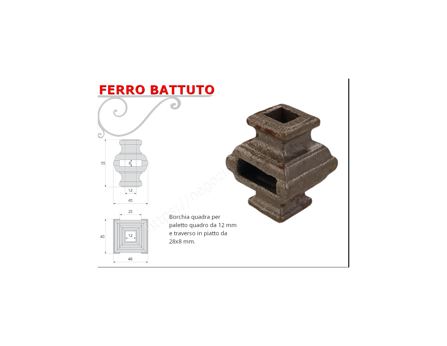 "Le nostre borchie quadre con foro da 12 mm e piatto da 25x8 sono perfette per la costruzione di inferriate e cancelletti. Realizzate in ferro grezzo, queste borchie sono saldabili e verniciabili, garantendo una durata e una resistenza eccezionali. Scegli la qualità e l’eleganza del ferro battuto per i tuoi progetti di sicurezza e design