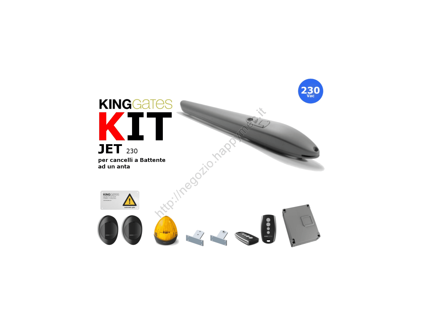 -35% Ultimi articoli in magazzino Kit "Jet" cancelli 1 anta Kit Jet grigio, automazione 24V per cancelli 1 anta fino 600kg KING-gates (V2 S.p.A) KJet24.1GR 694,67 € 1.068,72 € Peso confezione stimato per la spedizione kg.12,463 Aggiungi al carrello