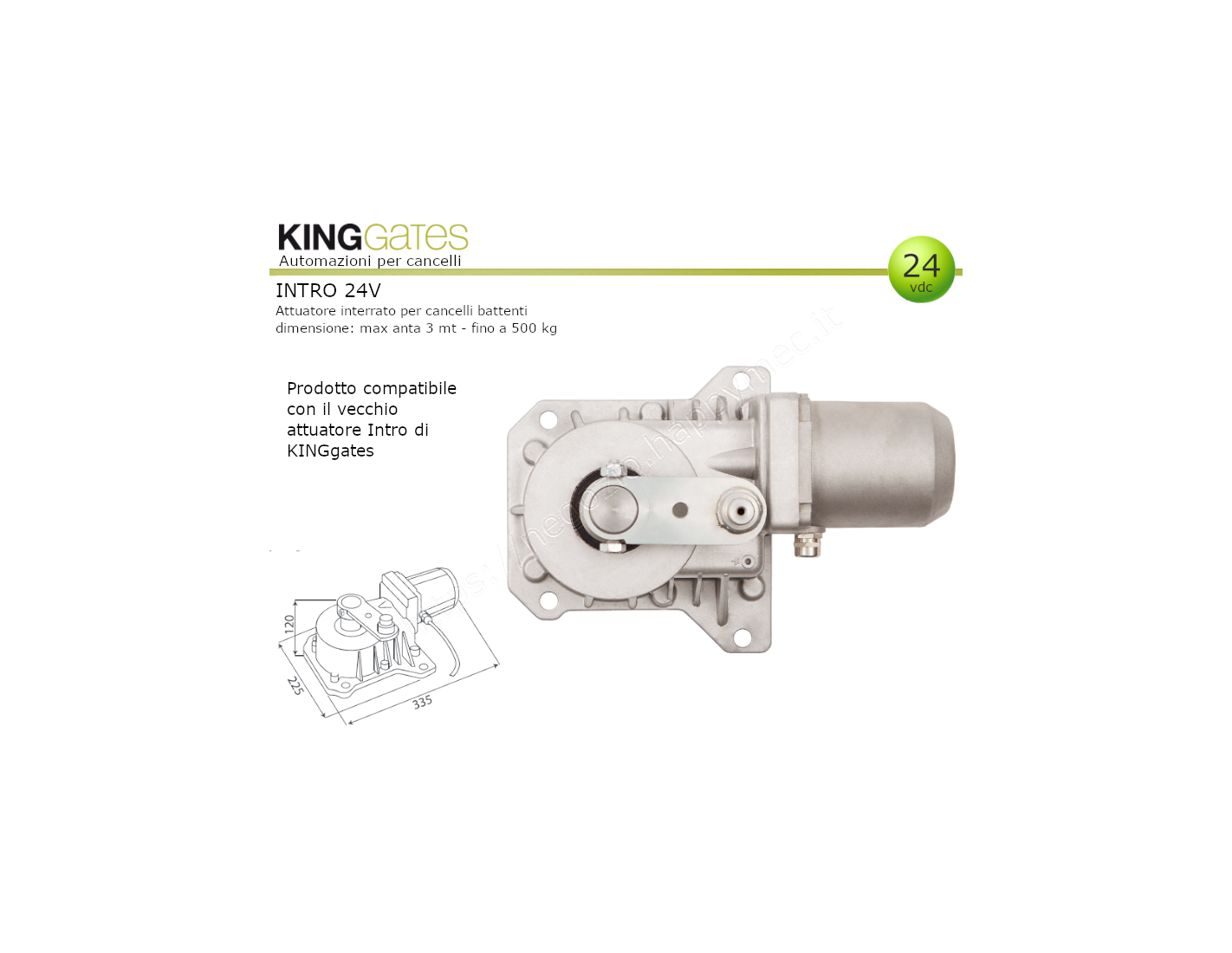 Questo motore è compatibile al 100% con i vecchi motori INTRO24 di KINGgates, ed è disponibile anche per la versione a 230Vac con il nome INTRO230.