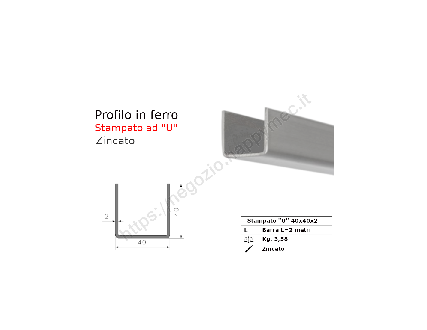Profilo "U" stampato a lati uguali 40x40x2 in barre zincate da 2 metri