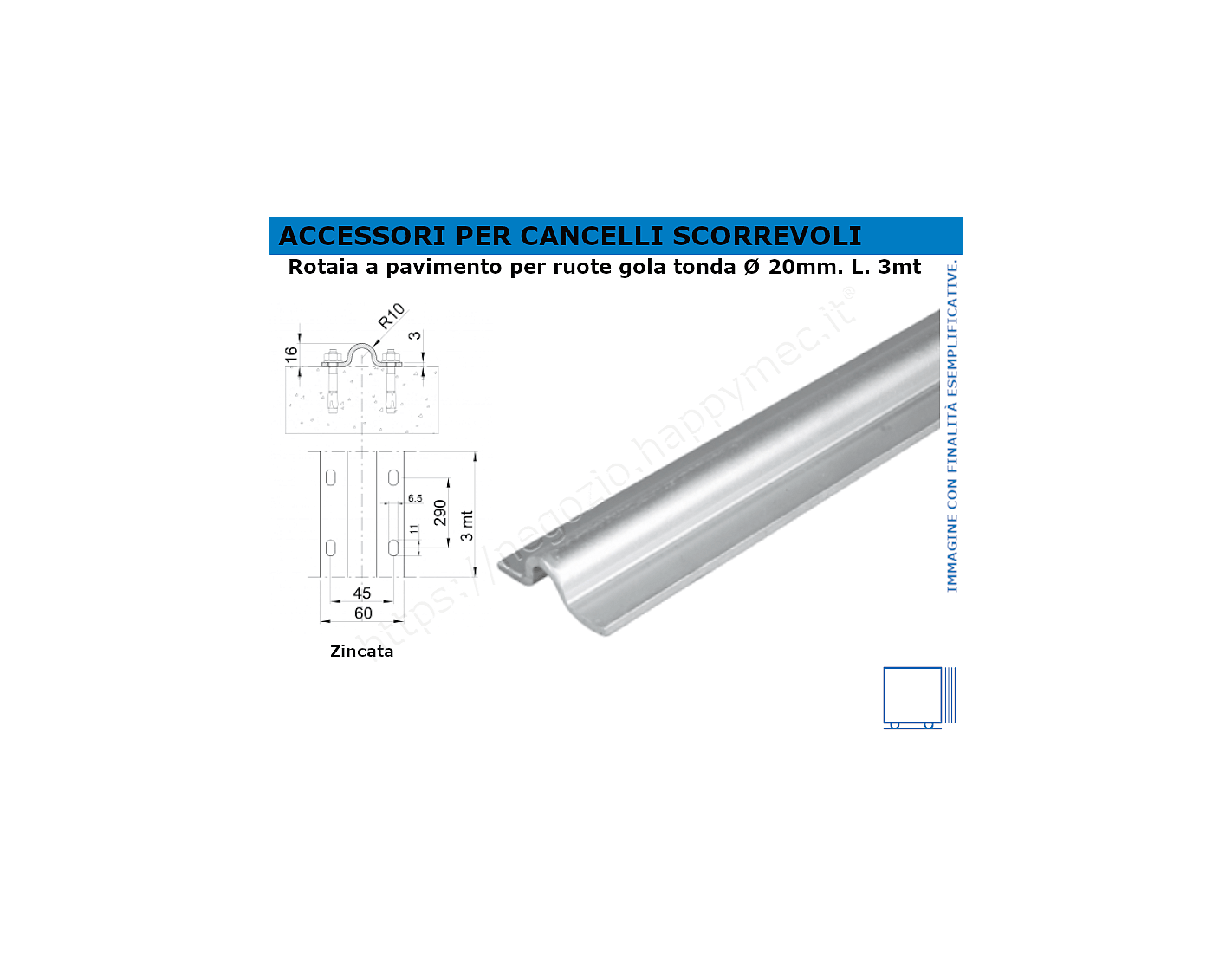 Rotaia a pavimento zincata da 3 mt per ruote gola diam. 20mm